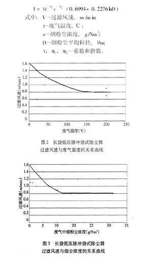 過濾風(fēng)速的選取是袋式除塵器設(shè)計(jì)的關(guān)鍵參數(shù),直接關(guān)系到除塵效率的高低。本文在對(duì)工程應(yīng)用中的各除塵器的相關(guān)參數(shù)測(cè)定后,通過曲線擬合,得出過濾風(fēng)速與廢氣溫度、廢氣中的煙粉塵濃度、煙粉塵粒徑之間的數(shù)學(xué)模型。同時(shí)經(jīng)檢驗(yàn)采用該模型來指導(dǎo)設(shè)計(jì),在一定范圍內(nèi)是可行的。